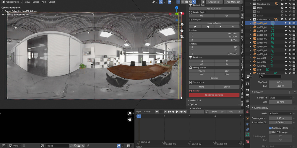 AP 360Cam is an add-on for Blender that helps you quickly set up Panoramic cameras and Render all images. You can literally set up 10 cameras and press render in less than a minute!